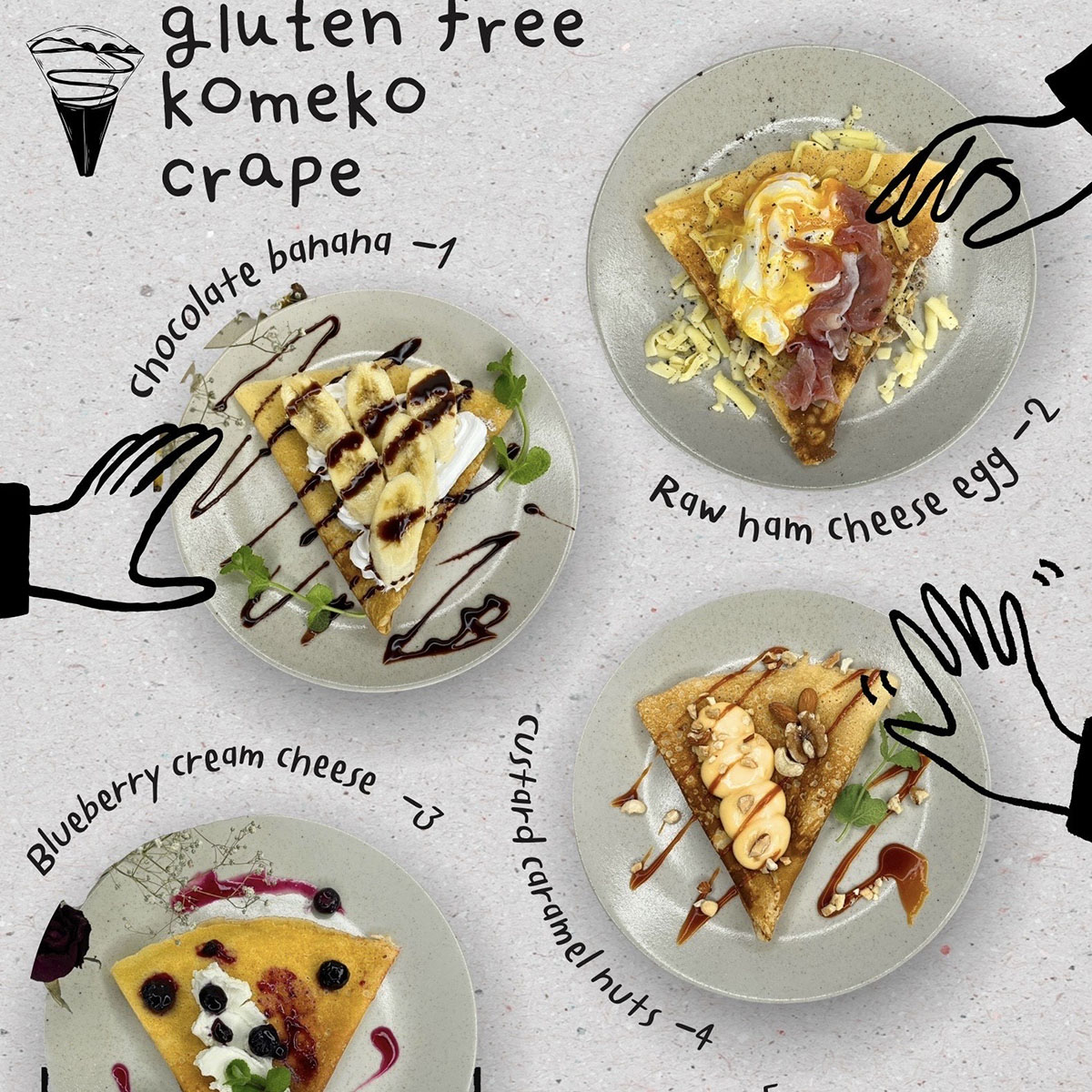 米粉のクレープ、ドリンク、スープ、夏はかき氷